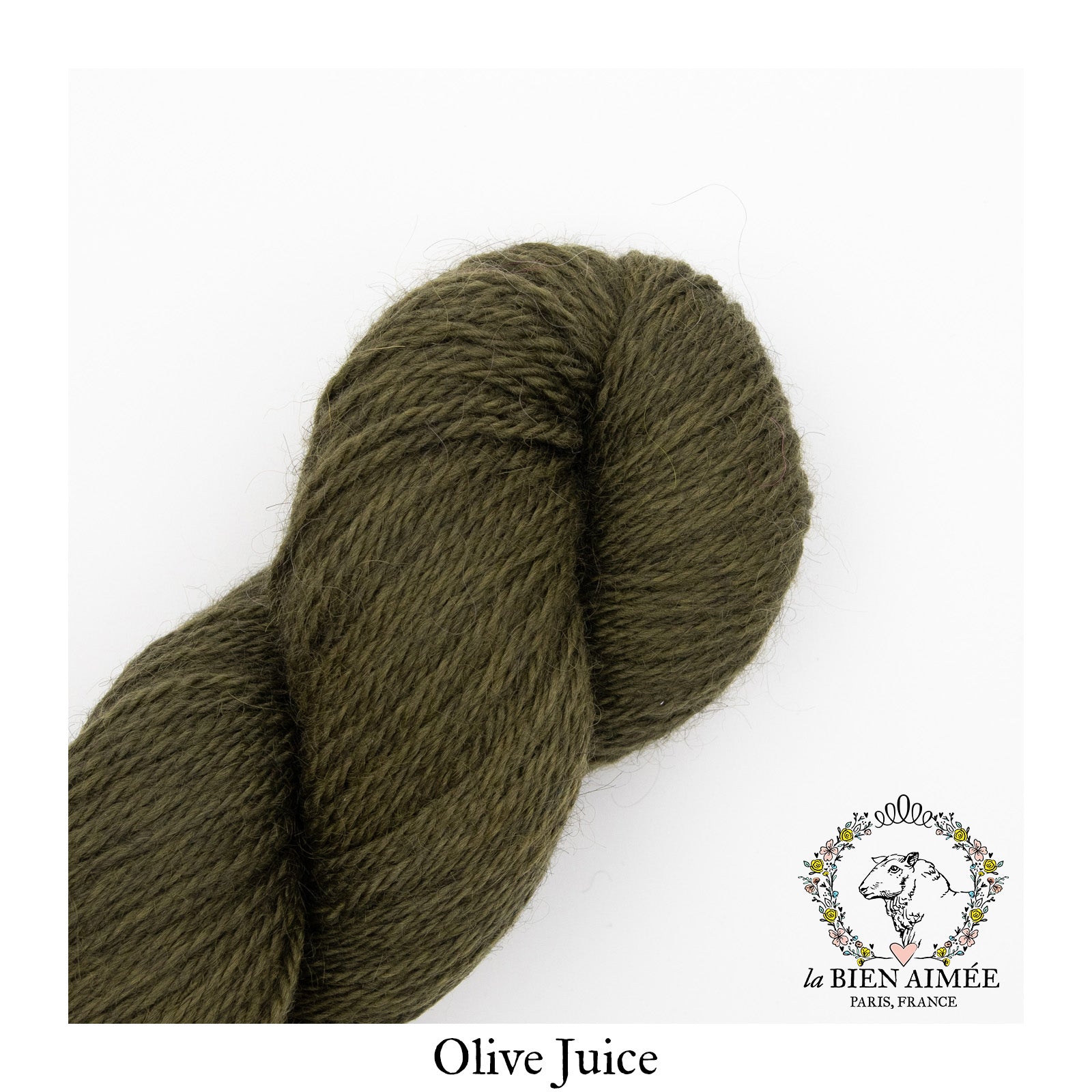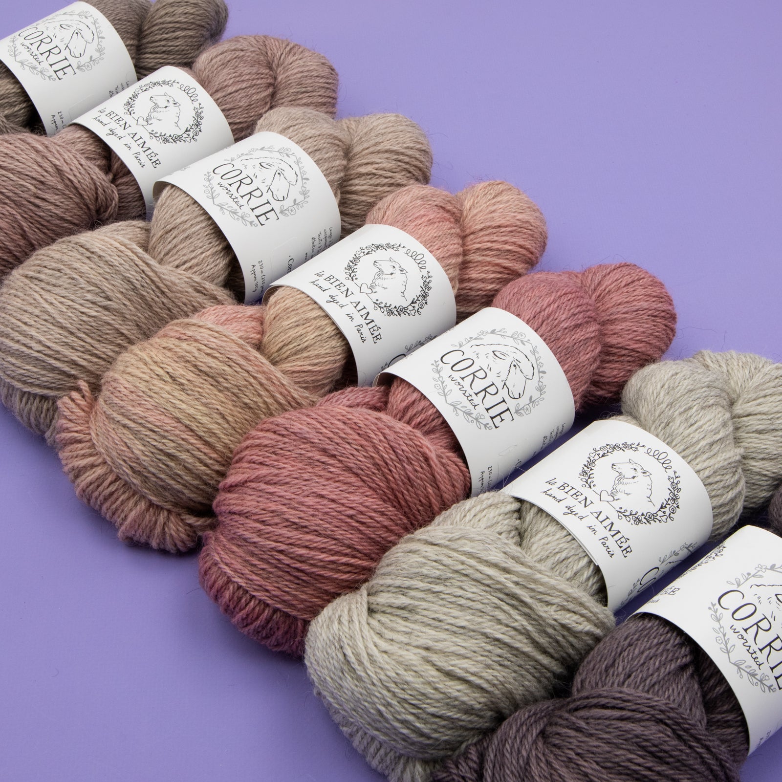 The big sister to Helix and Felix, Corrie Worsted is a natural Non-Superwash yarn base that is spun specially for La Bien Aimée. A light grey base color, we have dyed 30 of our best-selling tonal colors on it, including a few new colorways such as Avoine and Bone, Payne's Grey, Mist, Moria, Olive Juice, and Belle Rose.
