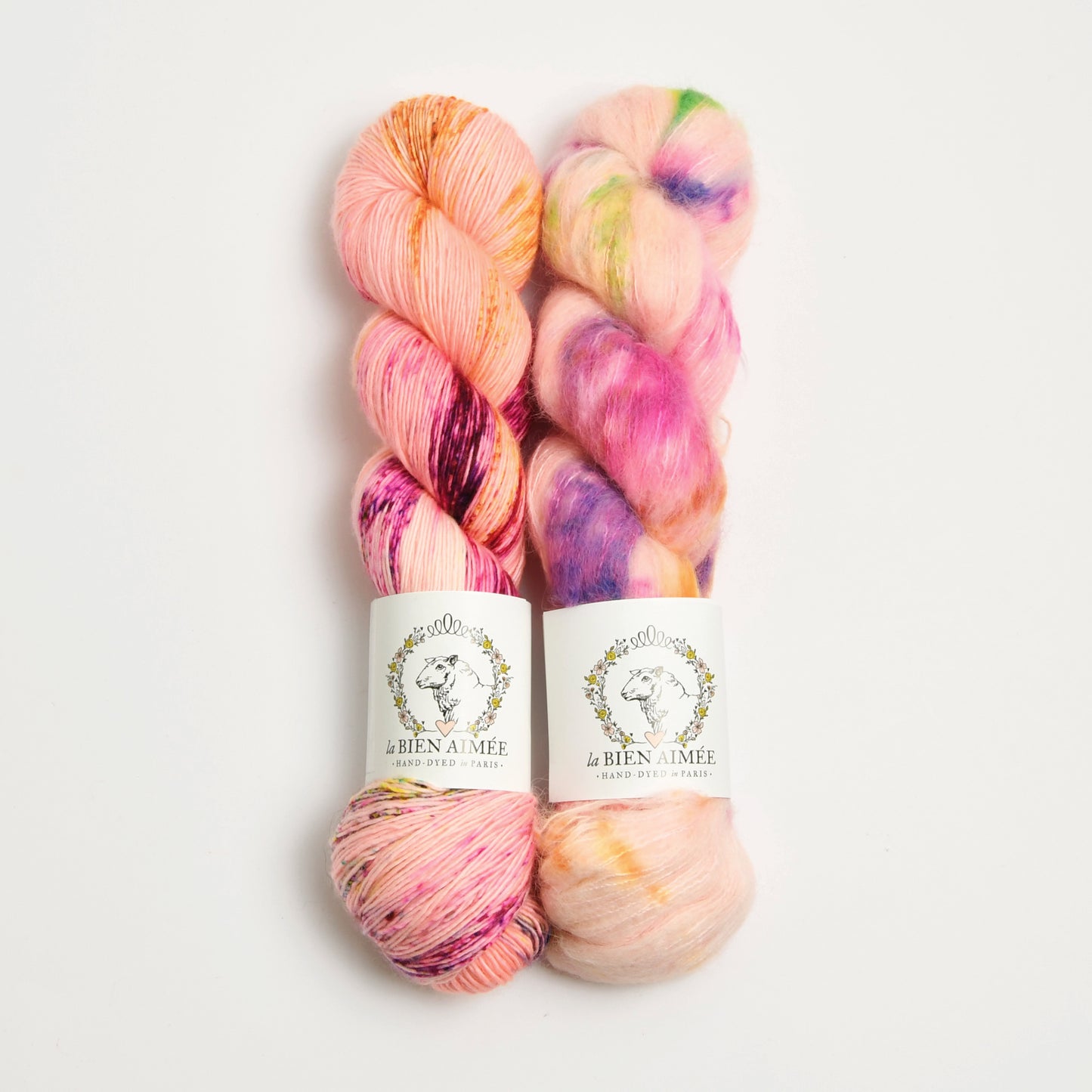 La variante Héliodore est composée d'un écheveau de Pretty and Pink en Merino Singles et d'1 écheveau d'Héliodore en Kumo. Kumo