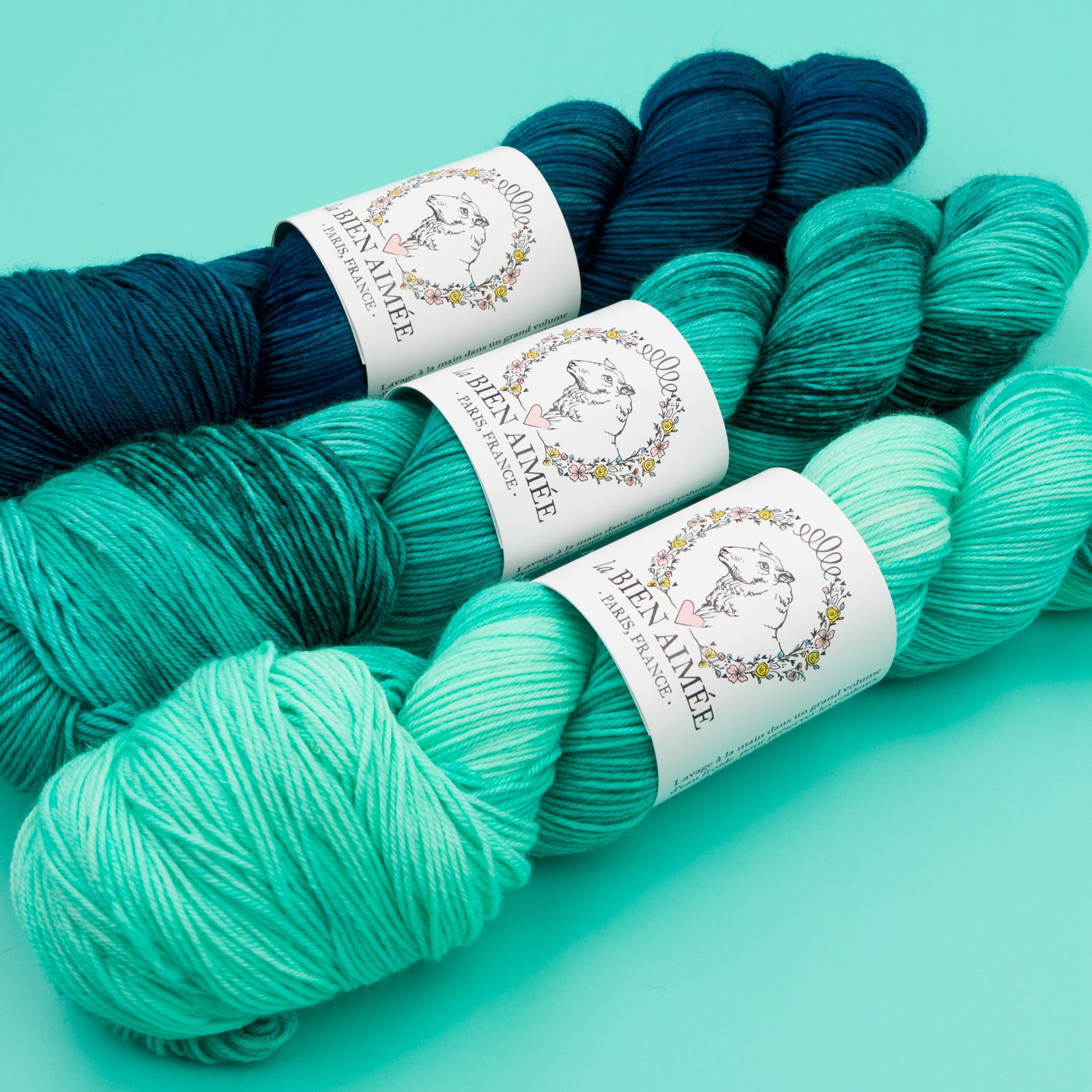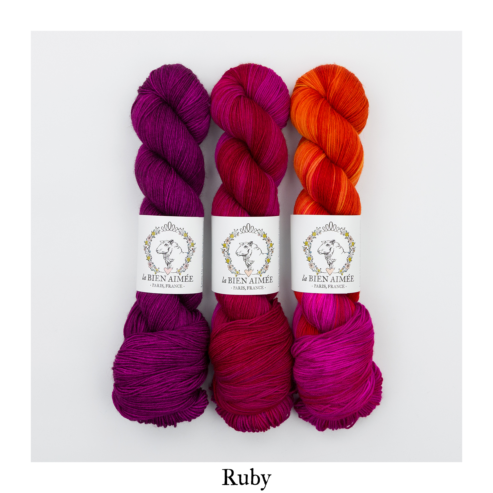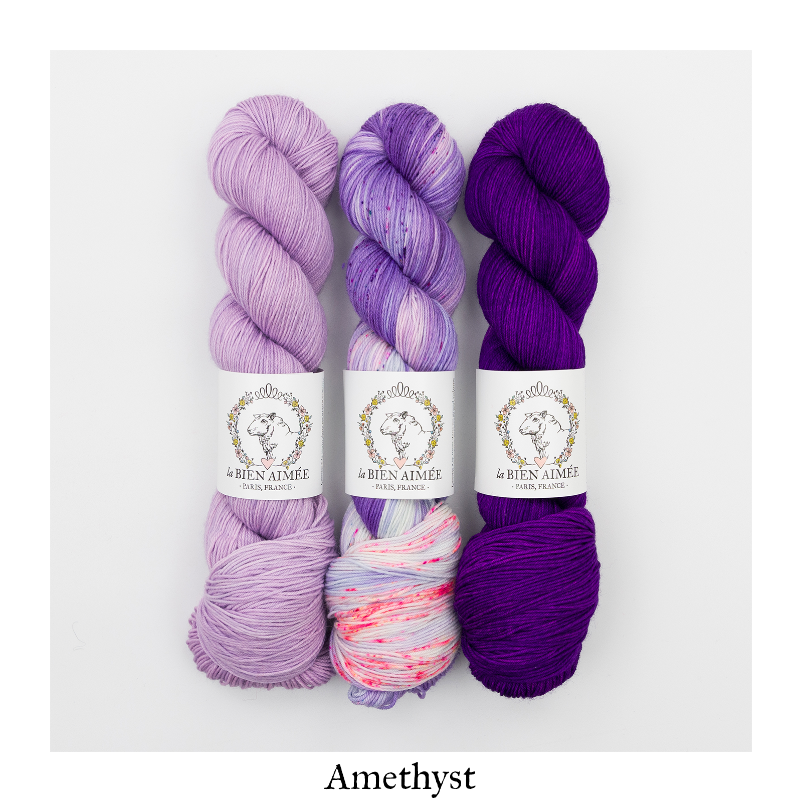 Alexandra and I created 4 brand new gem stone inspired fades containing 3 skeins of La Bien Aimée Merino Super Sock, especially for this design. You can find the yarn bundles called Amethyst, Ruby, Turquoise and Emerald, online now at labienaimee.com, as well as at the Circle of Stitches booth at Vogue Knitting Live this weekend.