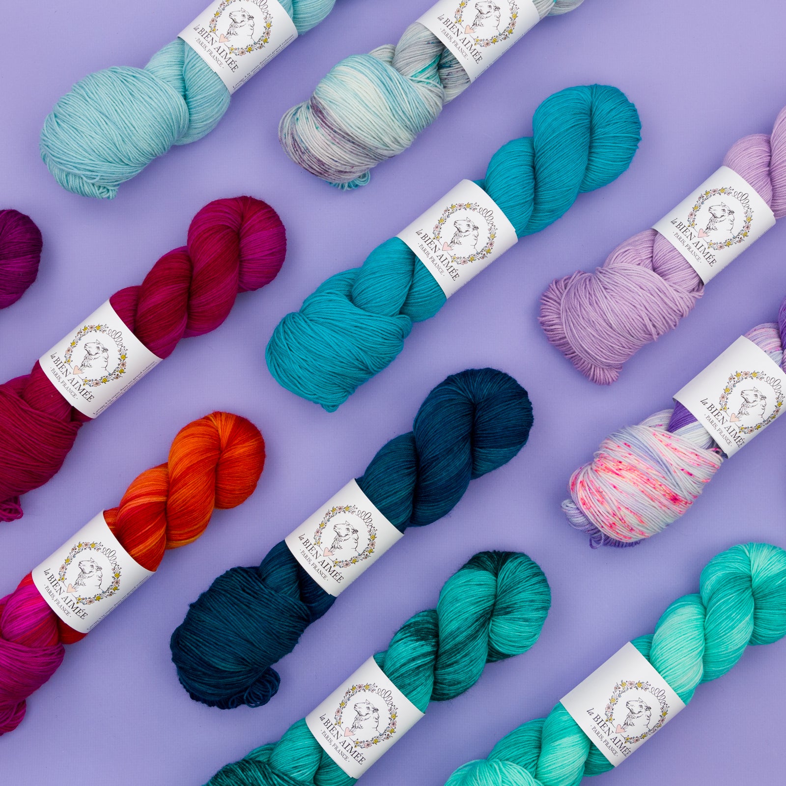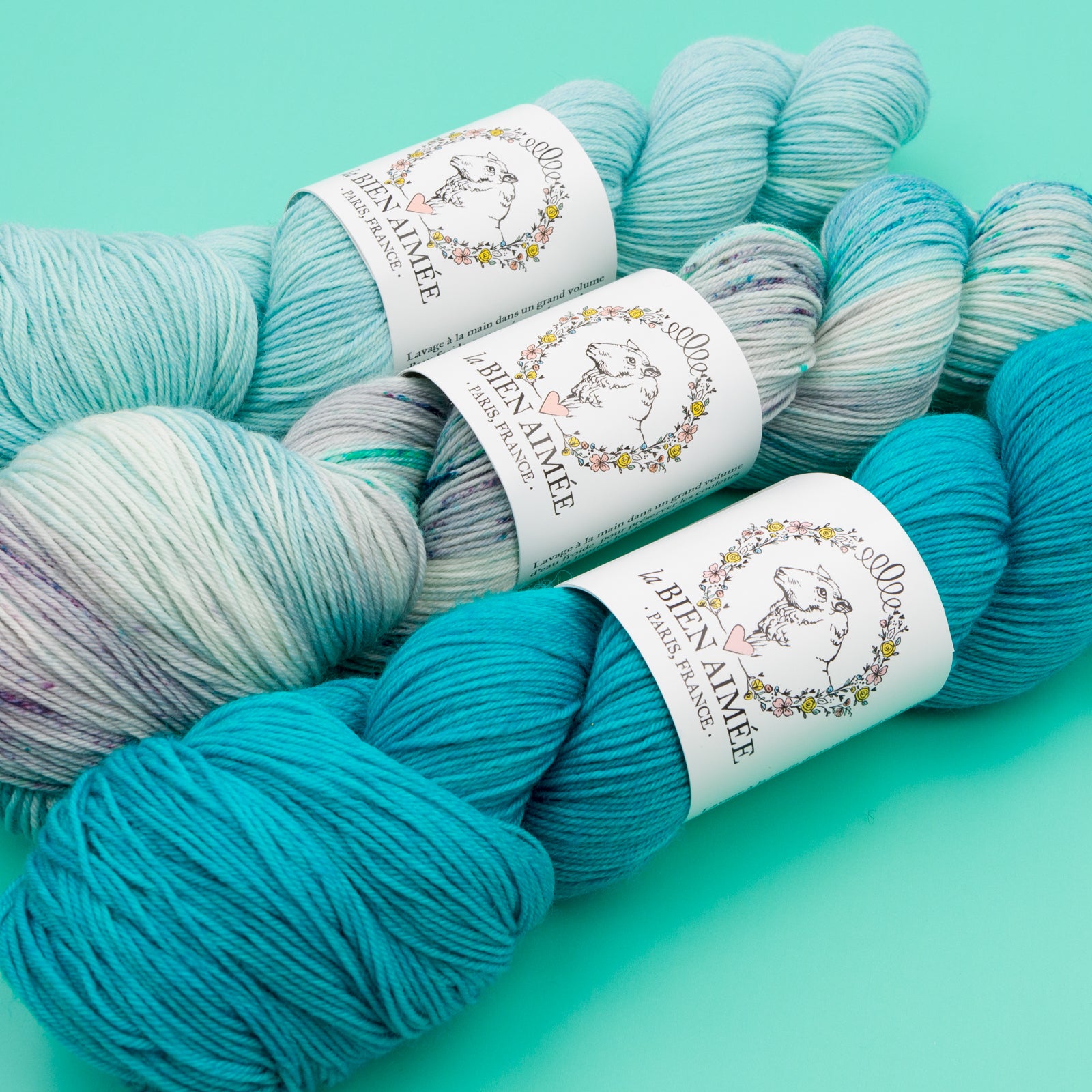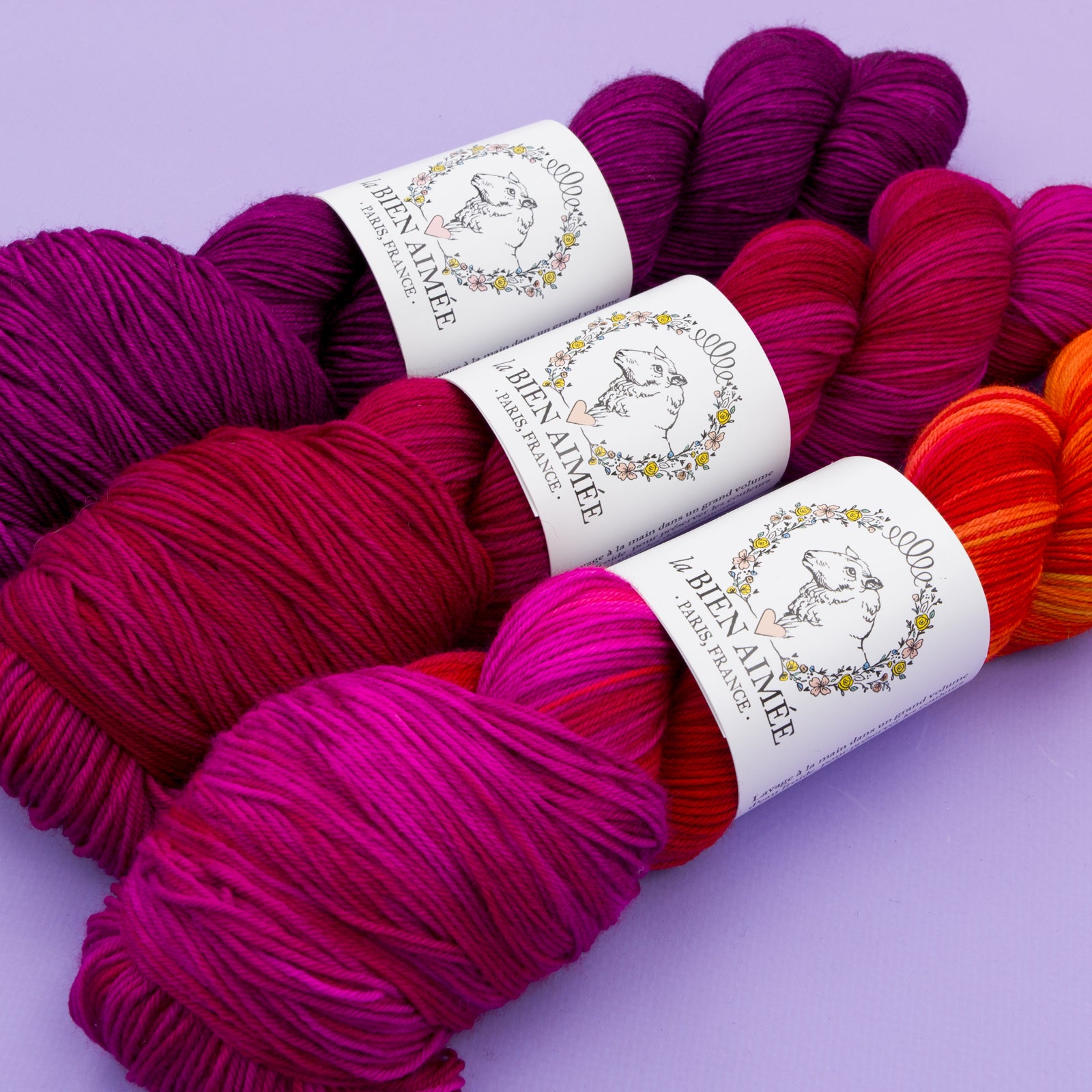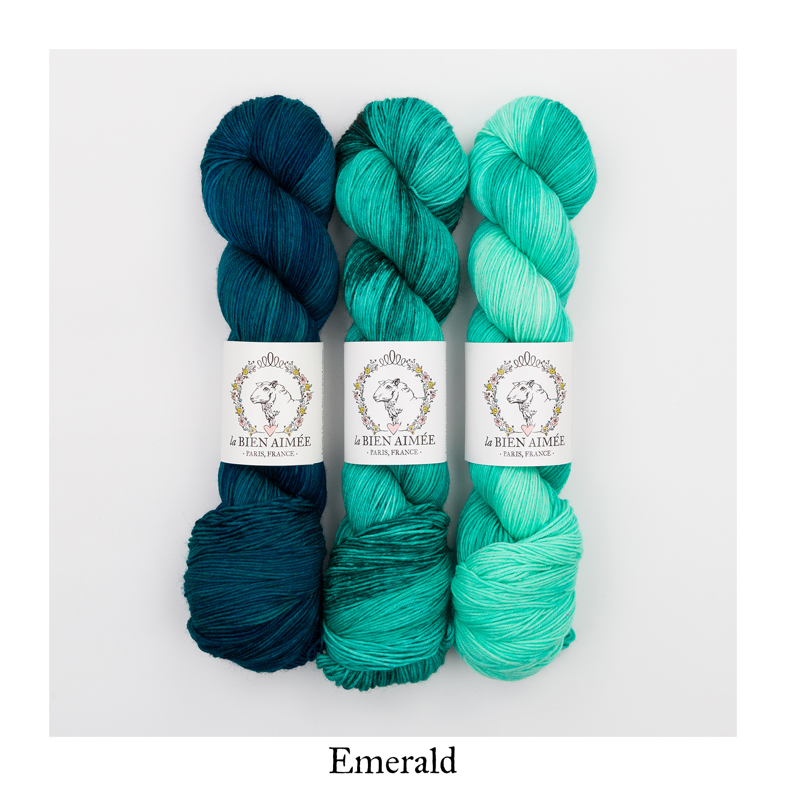Alexandra and I created 4 brand new gem stone inspired fades containing 3 skeins of La Bien Aimée Merino Super Sock, especially for this design. You can find the yarn bundles called Amethyst, Ruby, Turquoise and Emerald, online now at labienaimee.com, as well as at the Circle of Stitches booth at Vogue Knitting Live this weekend.