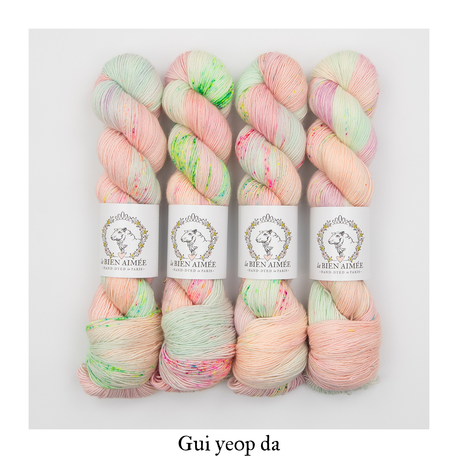 La Bien Aimée Merino Singles is a soft single-ply superwash merino with a beautiful twist. This yarn takes color beautifully and has a crisp stitch definition.