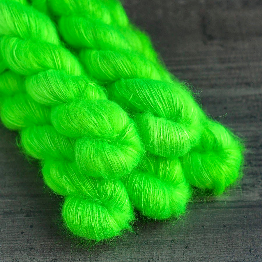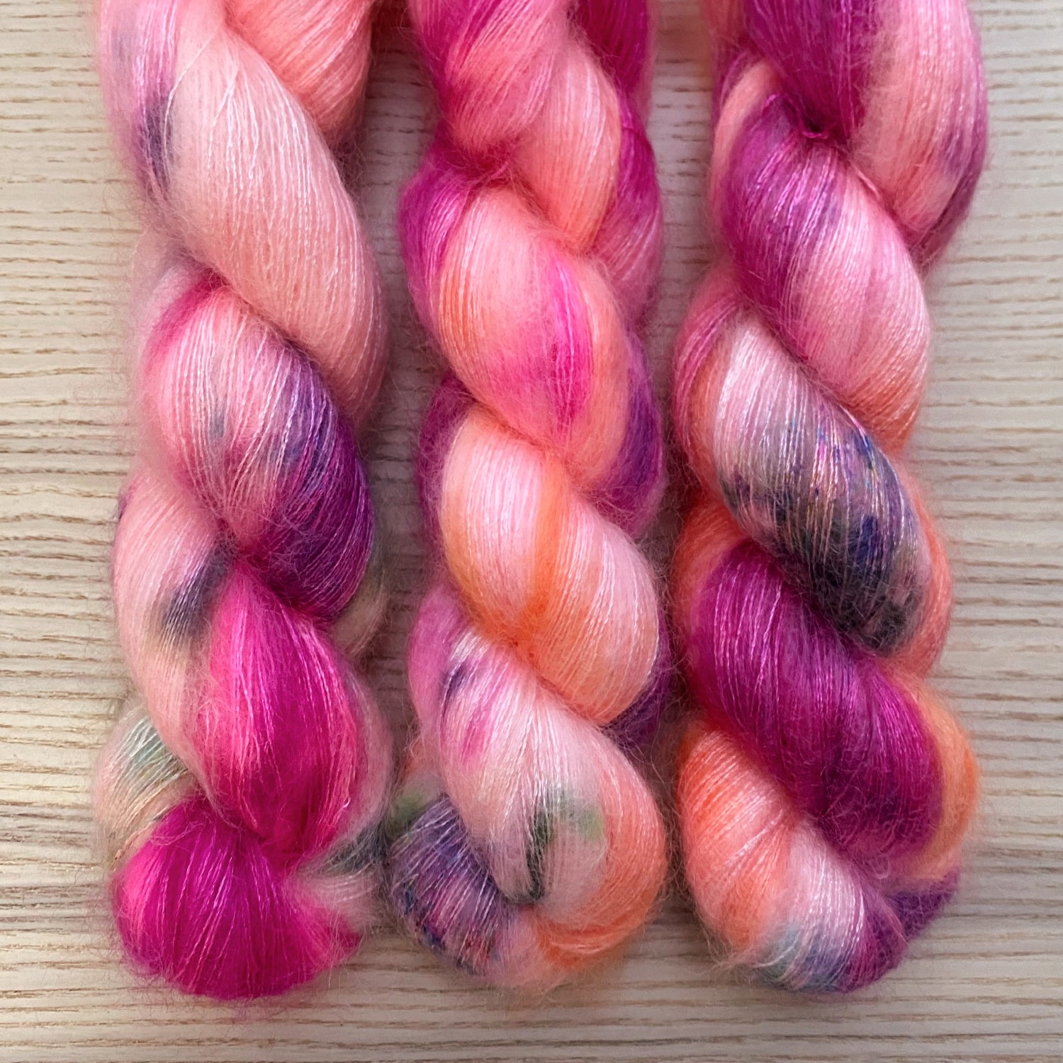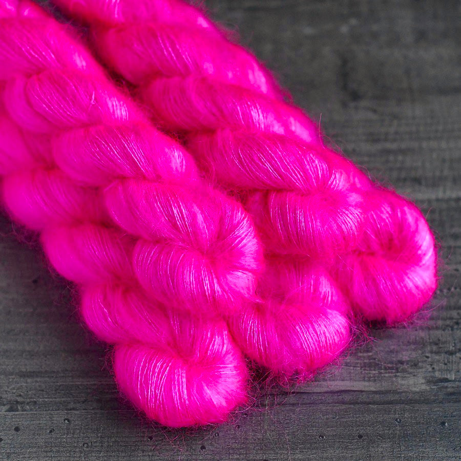 Add a strand of mohair to a DK weight hat or a pair of fingerless mitts and you instantly have a super cozy winter accessory! Mohair also adds great texture to any shawl, either held together with your yarn, or striped in for instant lightness.