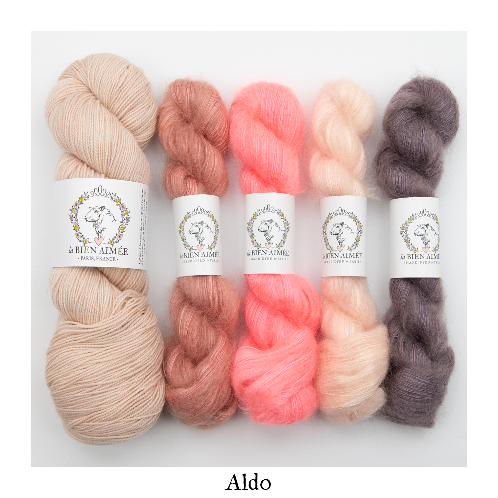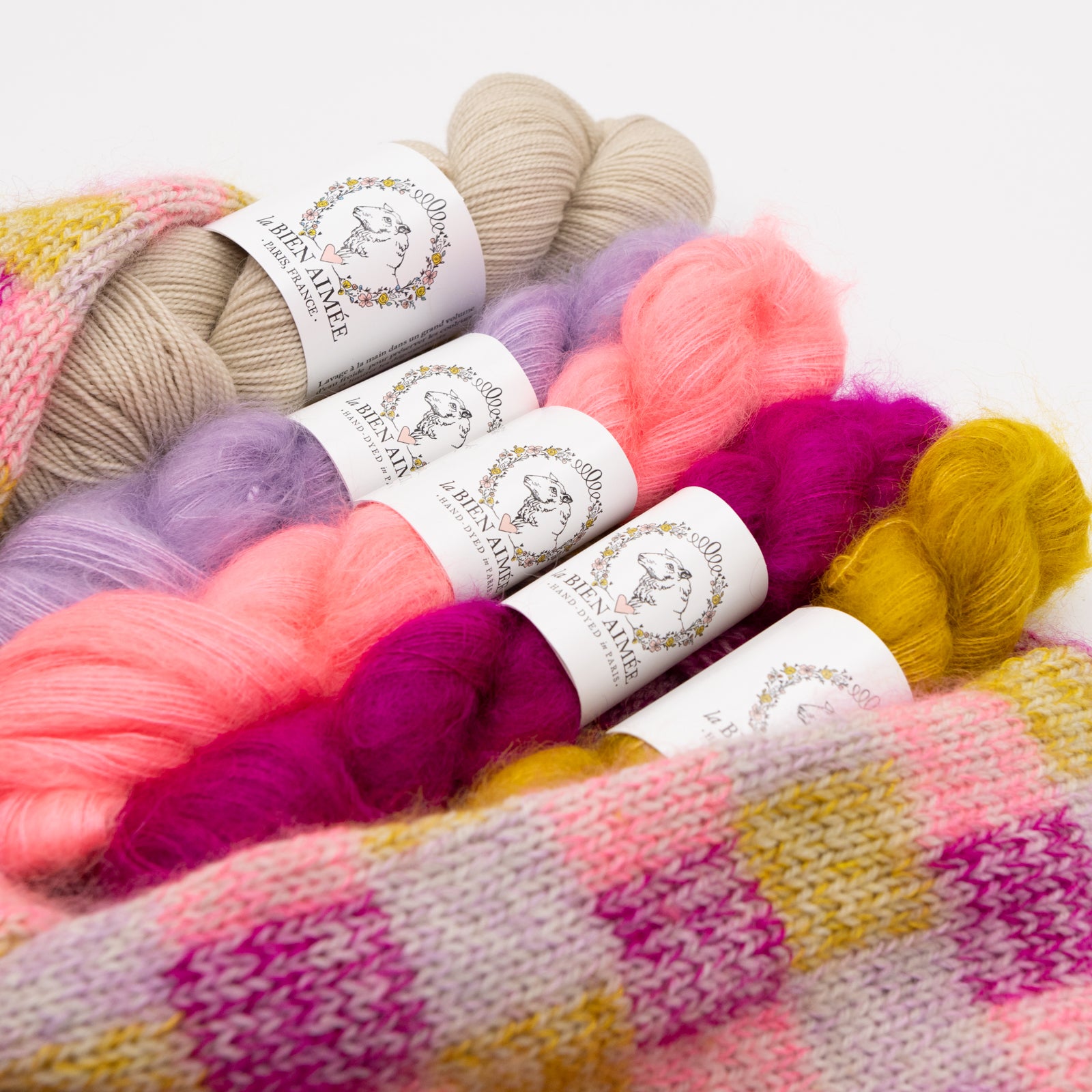 These bundles are inspired by Aimée’s original version of Nougat, and we’re also offering two special palettes created by her friends from Japan, Mari and Aldo, each with their own distinct color sensibility. Aldo’s version leans into soft pinks for a refined and harmonious look, while Mari’s palette is deeper and moodier, built around Bois de Rose and darker mohair shades. And because neons are always a good idea, we couldn’t resist adding a bold Neon version for knitters who love to make a statement.