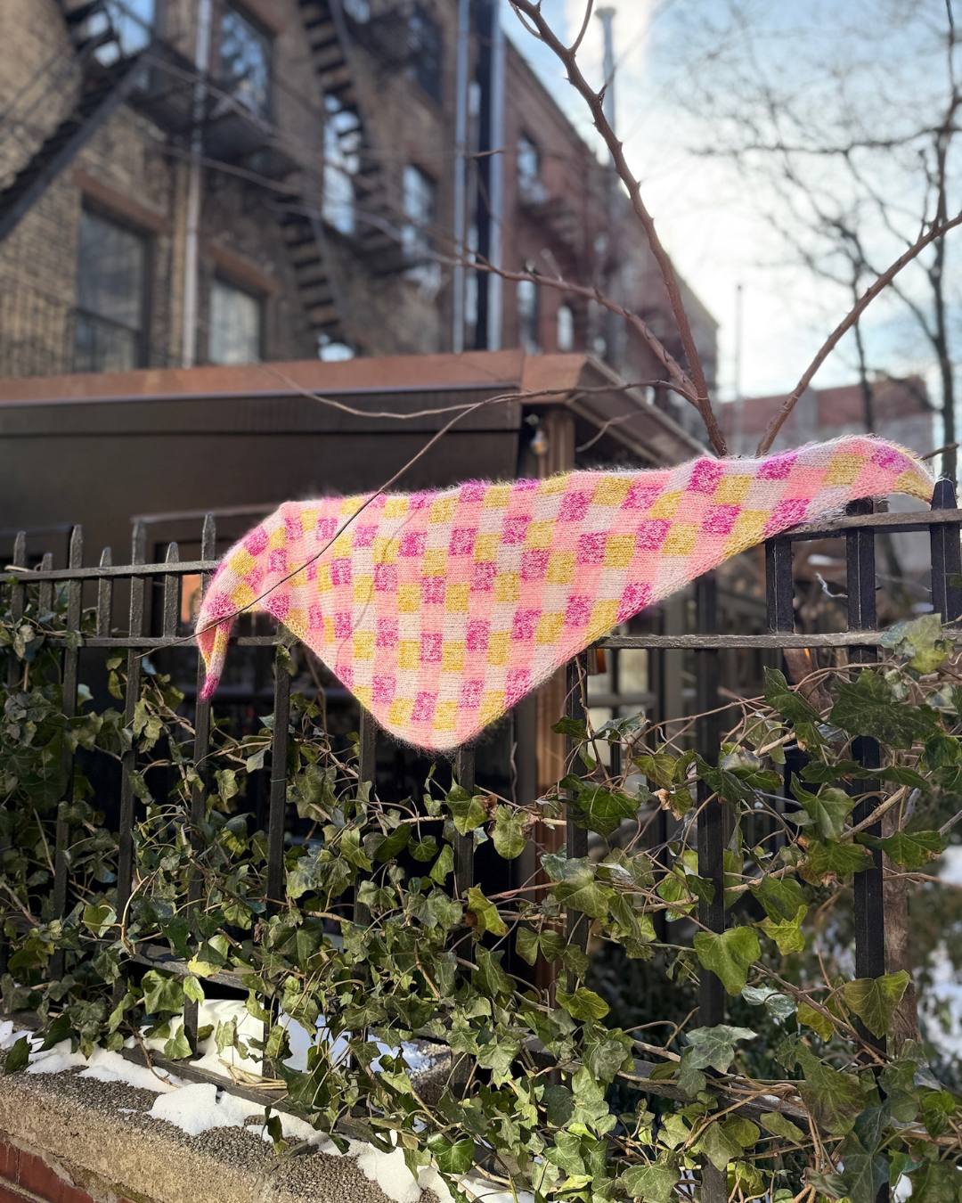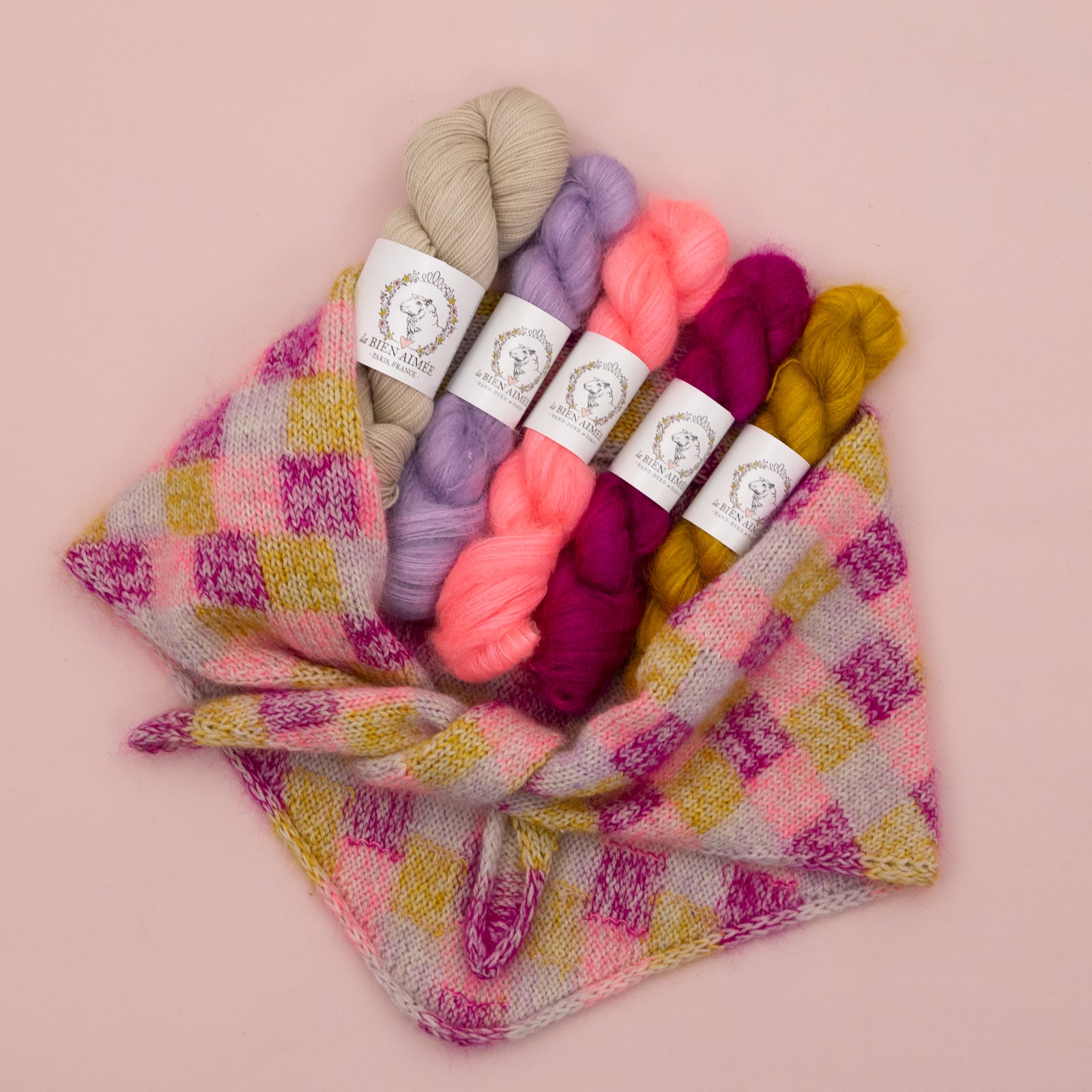 Twist Nouveau is a fingering-weight yarn spun from 100% non-superwash Merino, soft and natural, and known for taking color beautifully. Soyeux, made from Mohair and Silk, brings softness, warmth, and a deliciously fluffy texture—perfect for playing with color changes in the checkerboard motif.