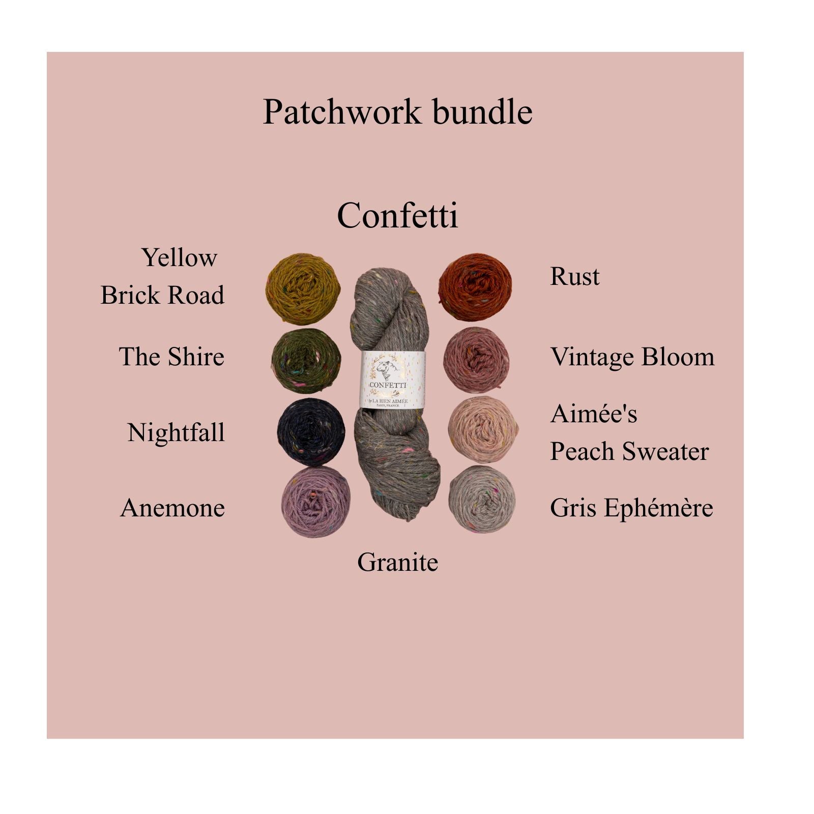 8 - ~25g cakes of Confetti in Aimée's Peach Sweater, Anemone, Gris Ephémère, Nightfall, Rust, The Shire, and Yellow Brick Road