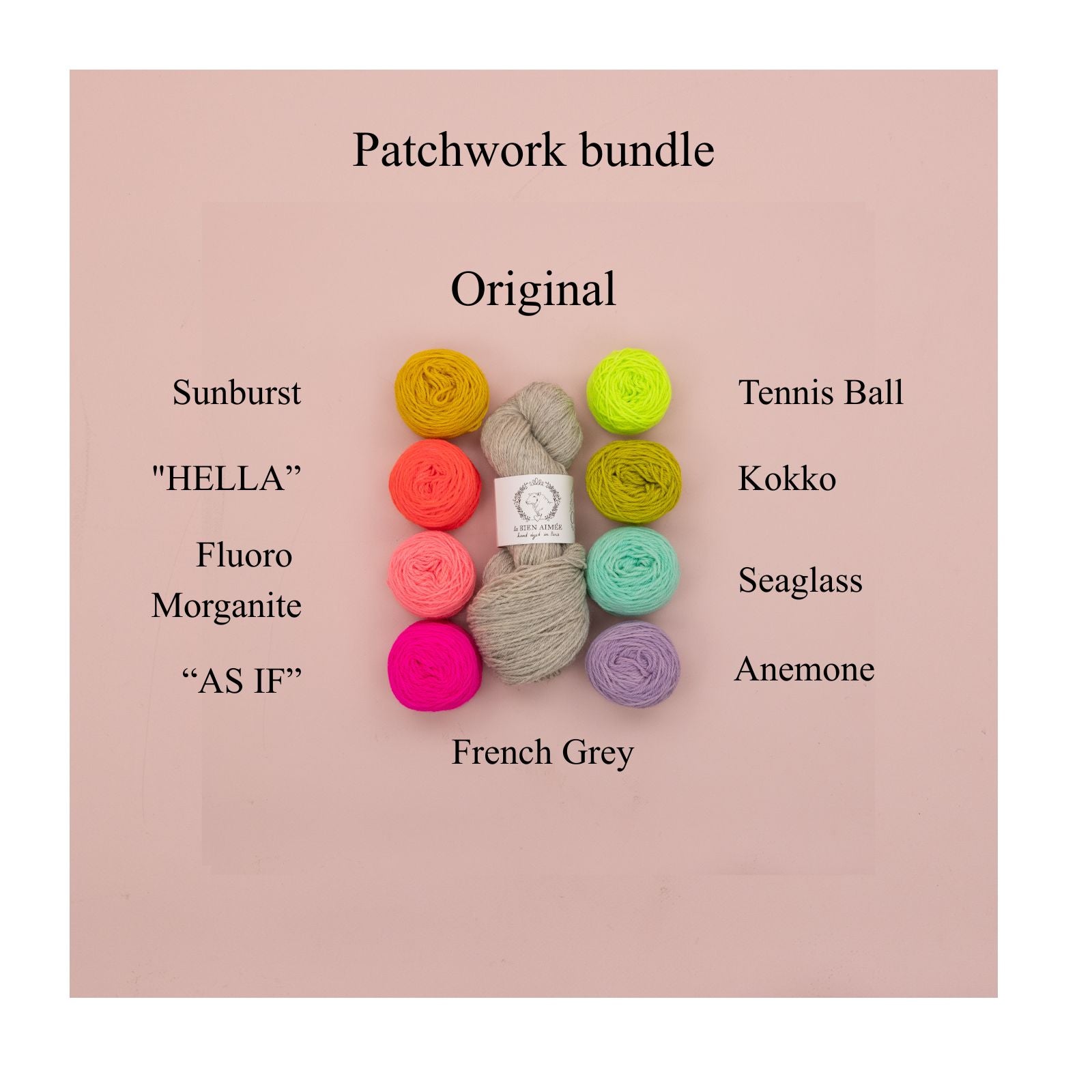 The Original contains exactly the yarn used in the original sample charted in the pattern. While Julia and Confetti contain enough yarn to complete the Patchwork pattern, the color placement is not charted. The layout is up to you, and you can use each contrast color for up to 20 squares.