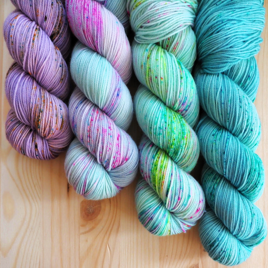 Your kit will contain: La Bien Aimée Merino Sport (100% superwash merino wool; 325m/100g) in the following fades: