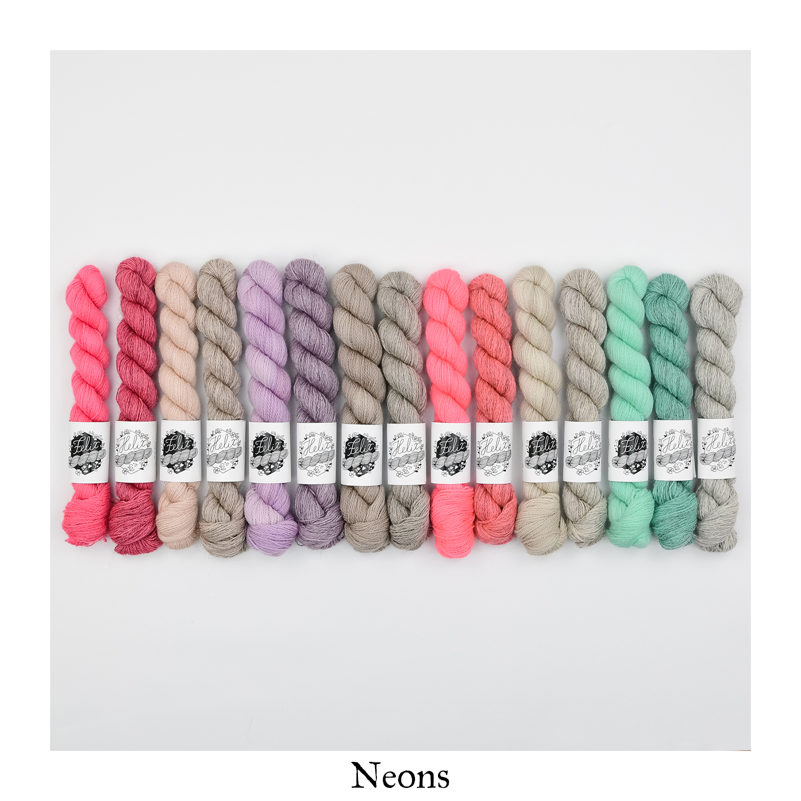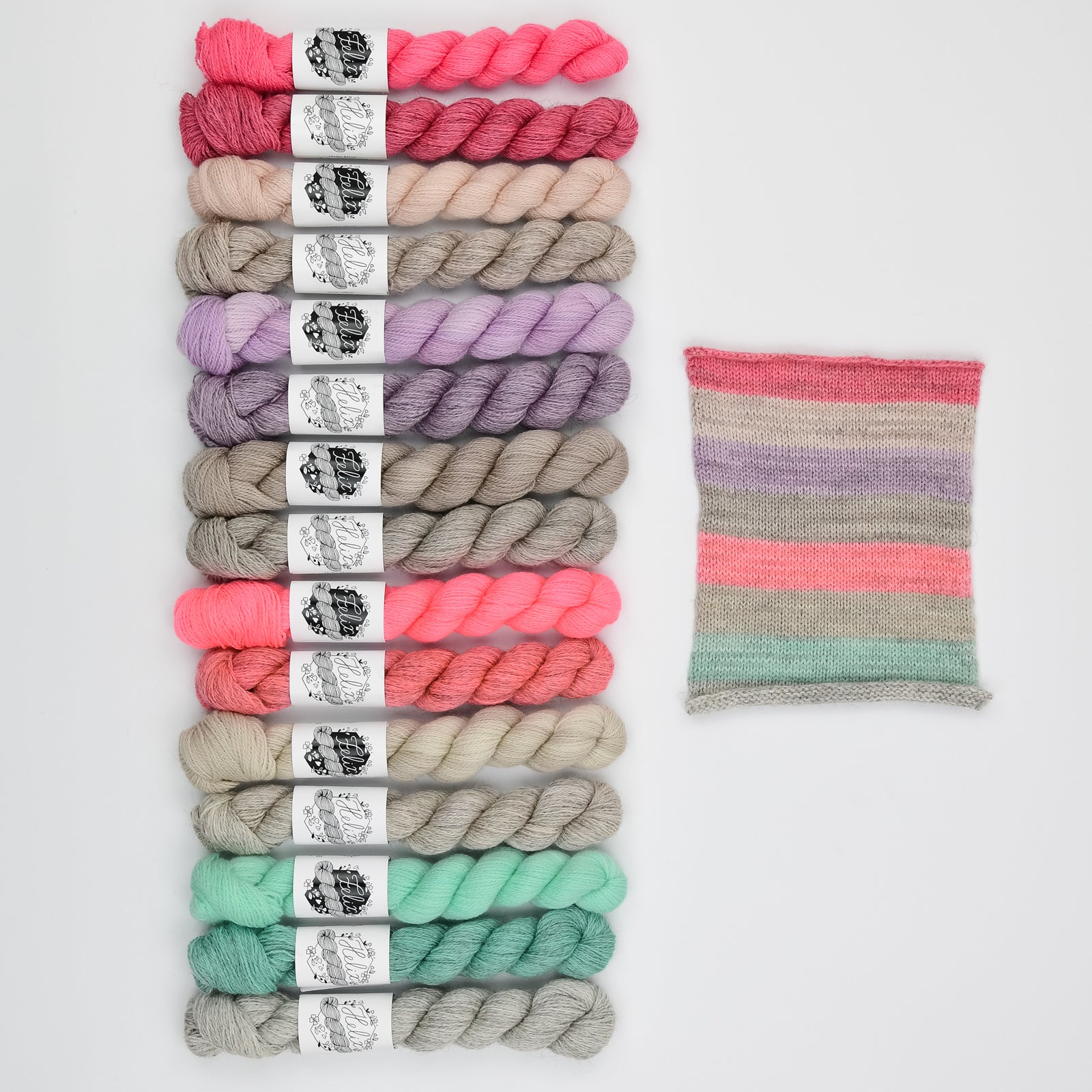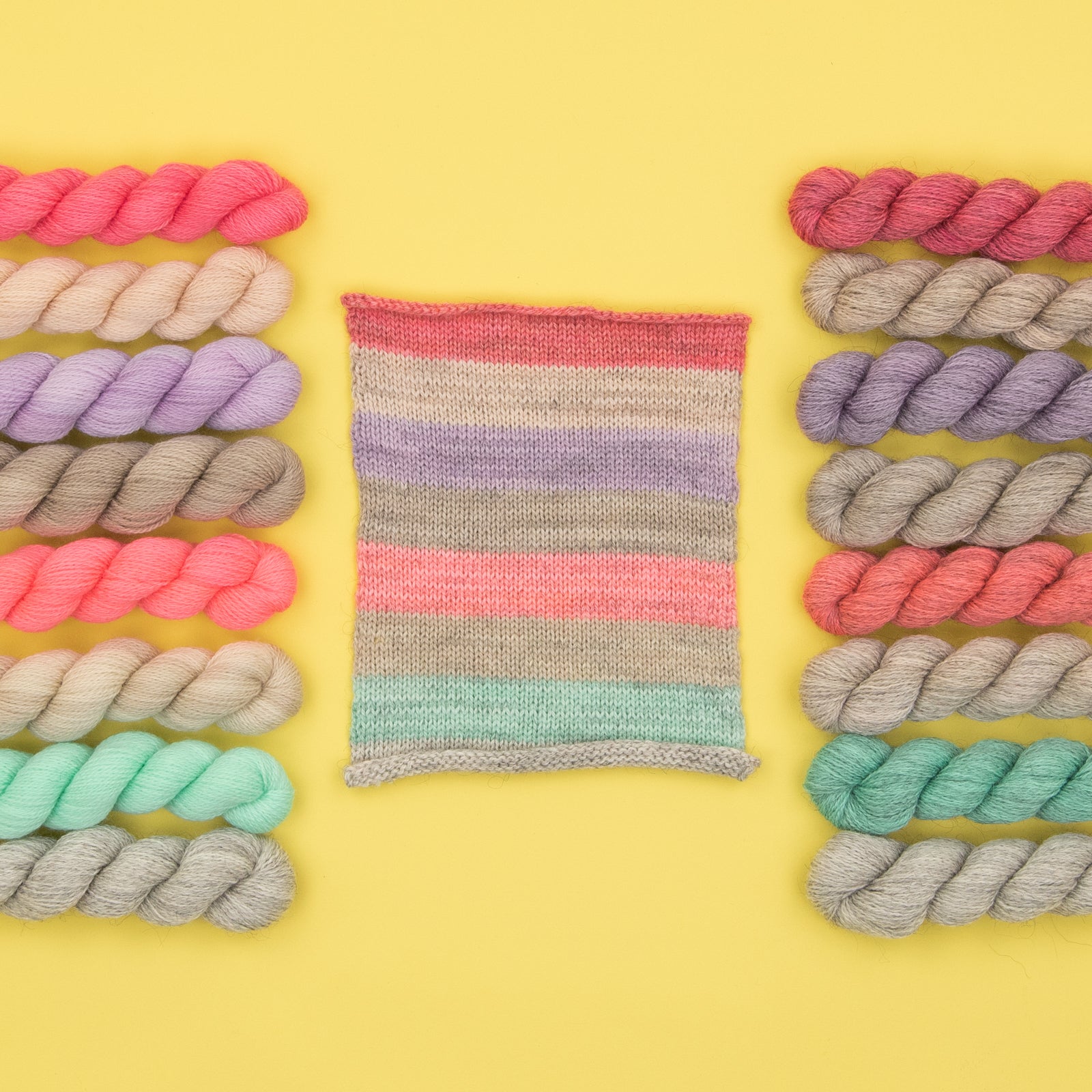 The Neons version takes the fun to the max with Helix and Felix held double throughout! It alternates neon and neutral stripes in the following colors: Fluoro Morganite, Sansa, Anemone, Bone, The Hotness, Avoine, Seaglass and French Grey.
