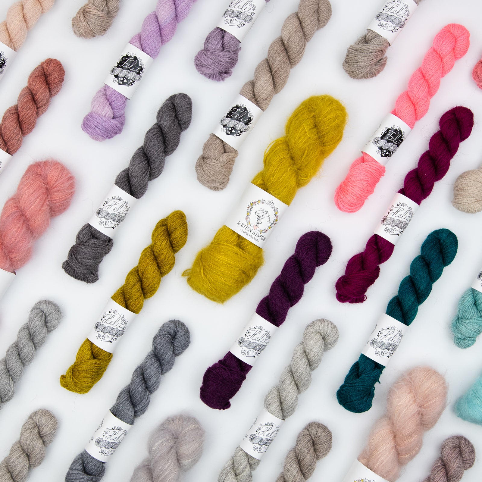 These bundles are offered in Helix and Felix minis when they contain up to 2 minis of each color. Starting with 3 minis, they are replaced with a full skein, as it is more cost effective this way.
