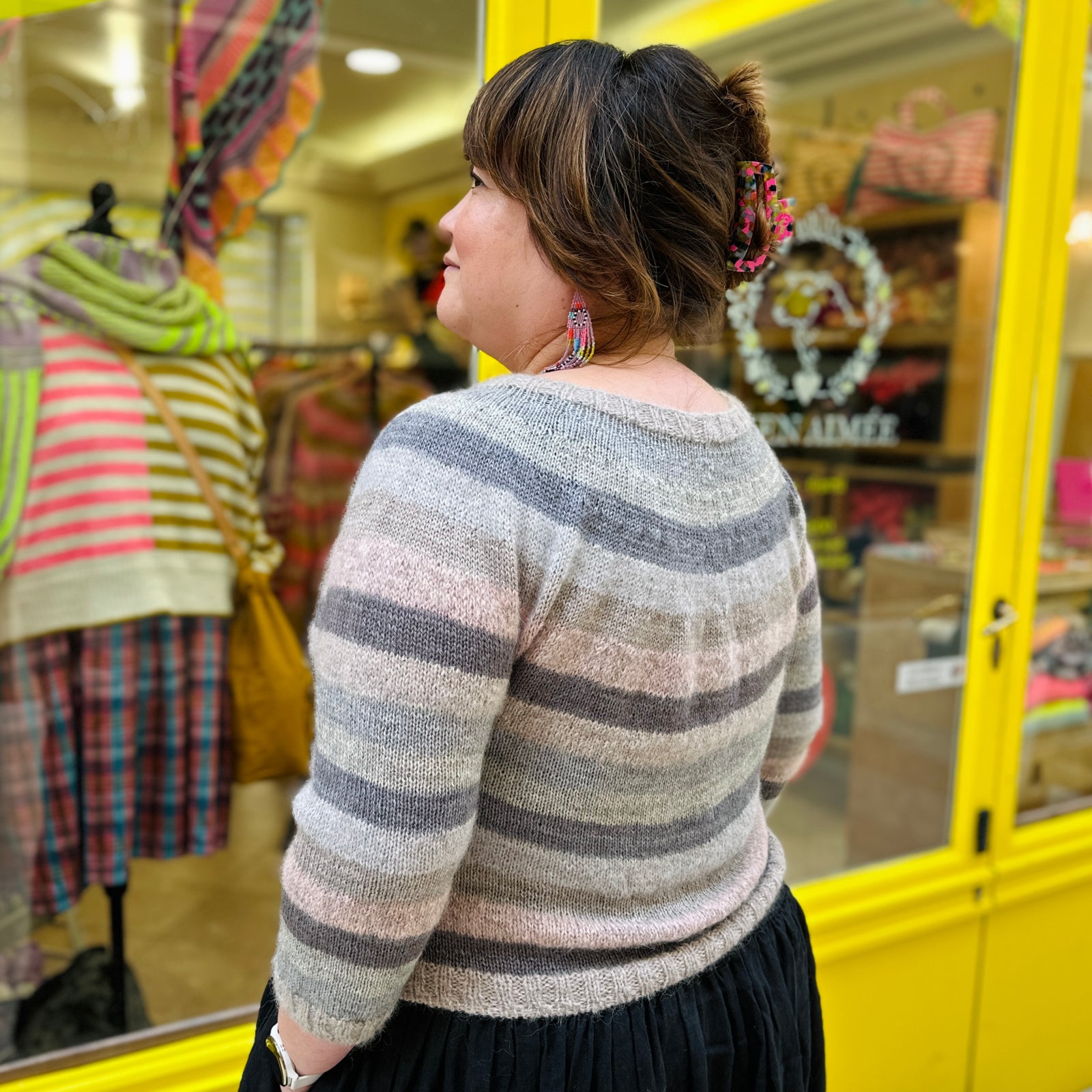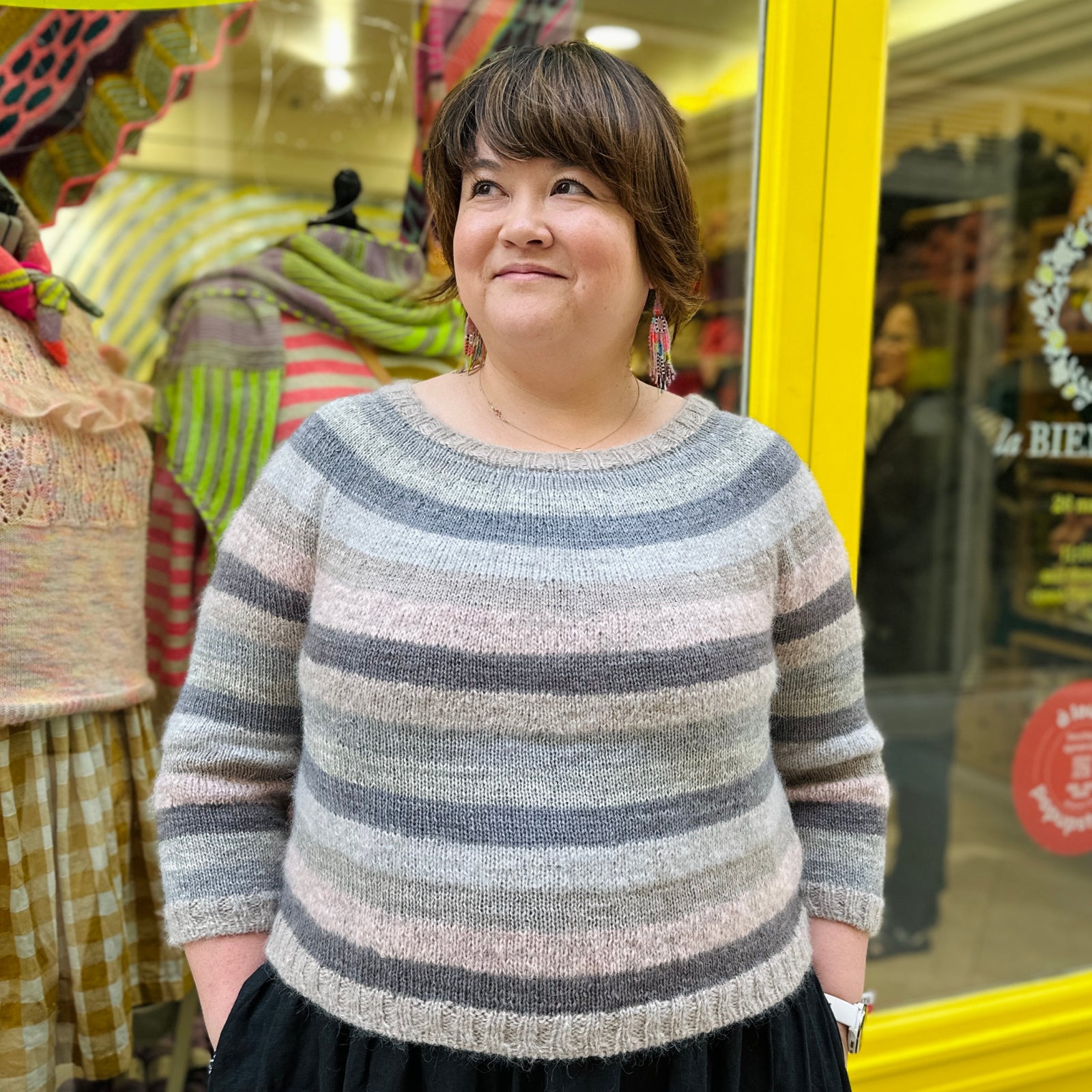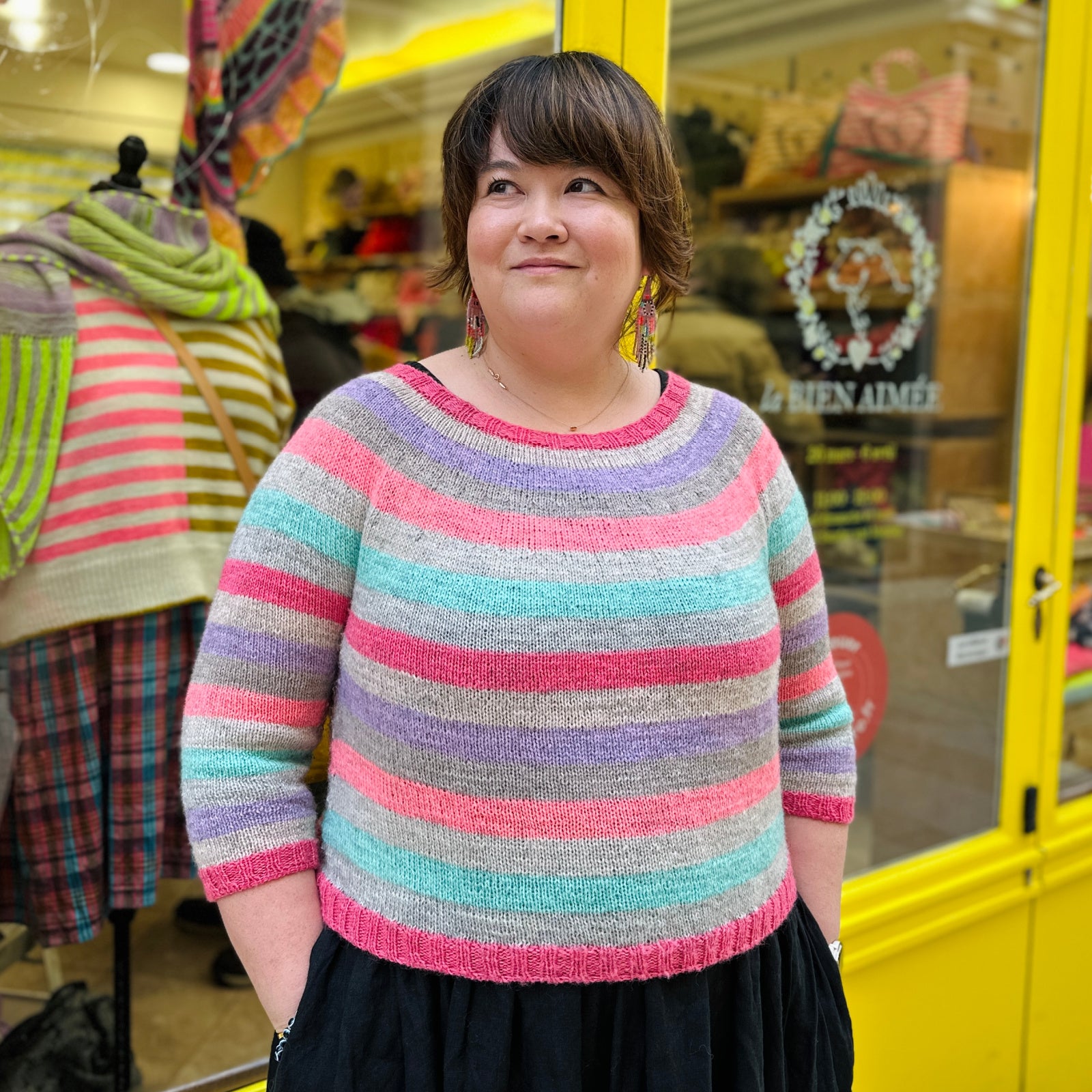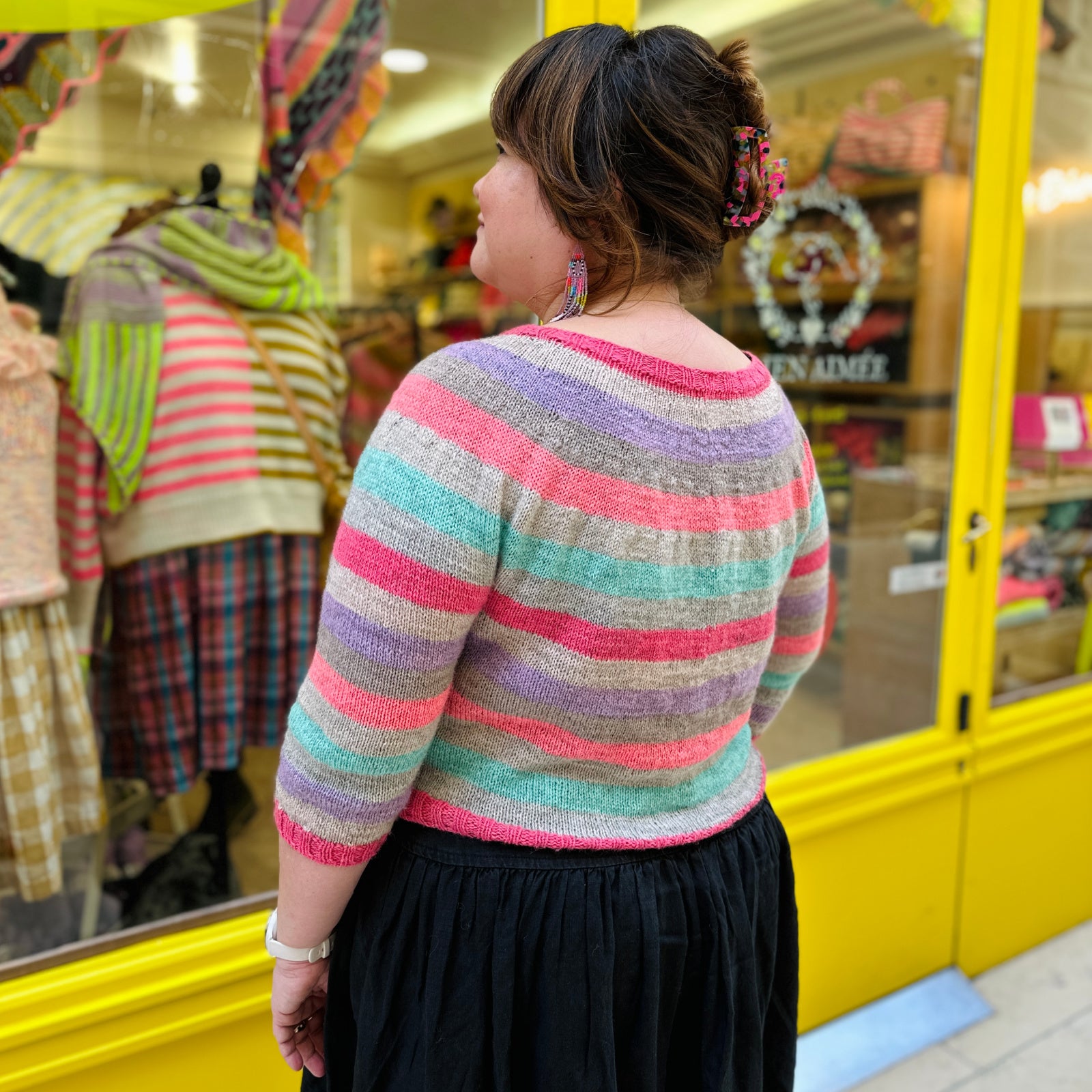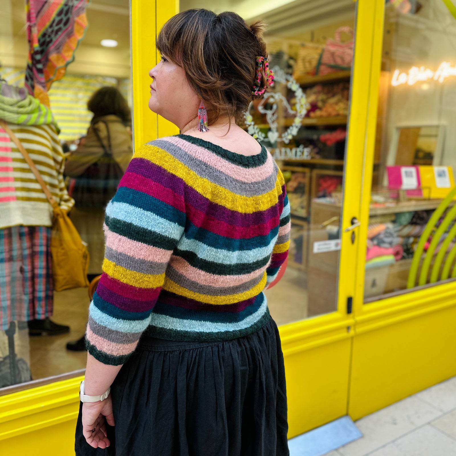 Aimée's version features beautiful jewel tones, with some stripes in Helix held double, and others in Helix and Kumo held together. It contains the following colors (in order): Emeline, Dawn, Stone, Yellow Brick Road, Madeleine, Lise, Isle of Aran, Vespa. Yellow Brick Road, Vespa and Dawn are held with Kumo.