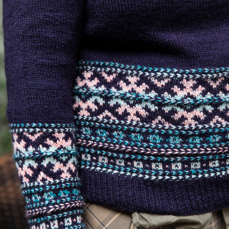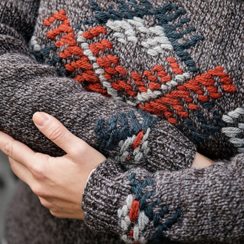 This book contains the pattern for Tuljak Sweater, which uses La Bien Aimée Helix in the colors Gaji, French Grey, and Sophie, and Felix in the colors Seaglass and Fluoro Morganite.