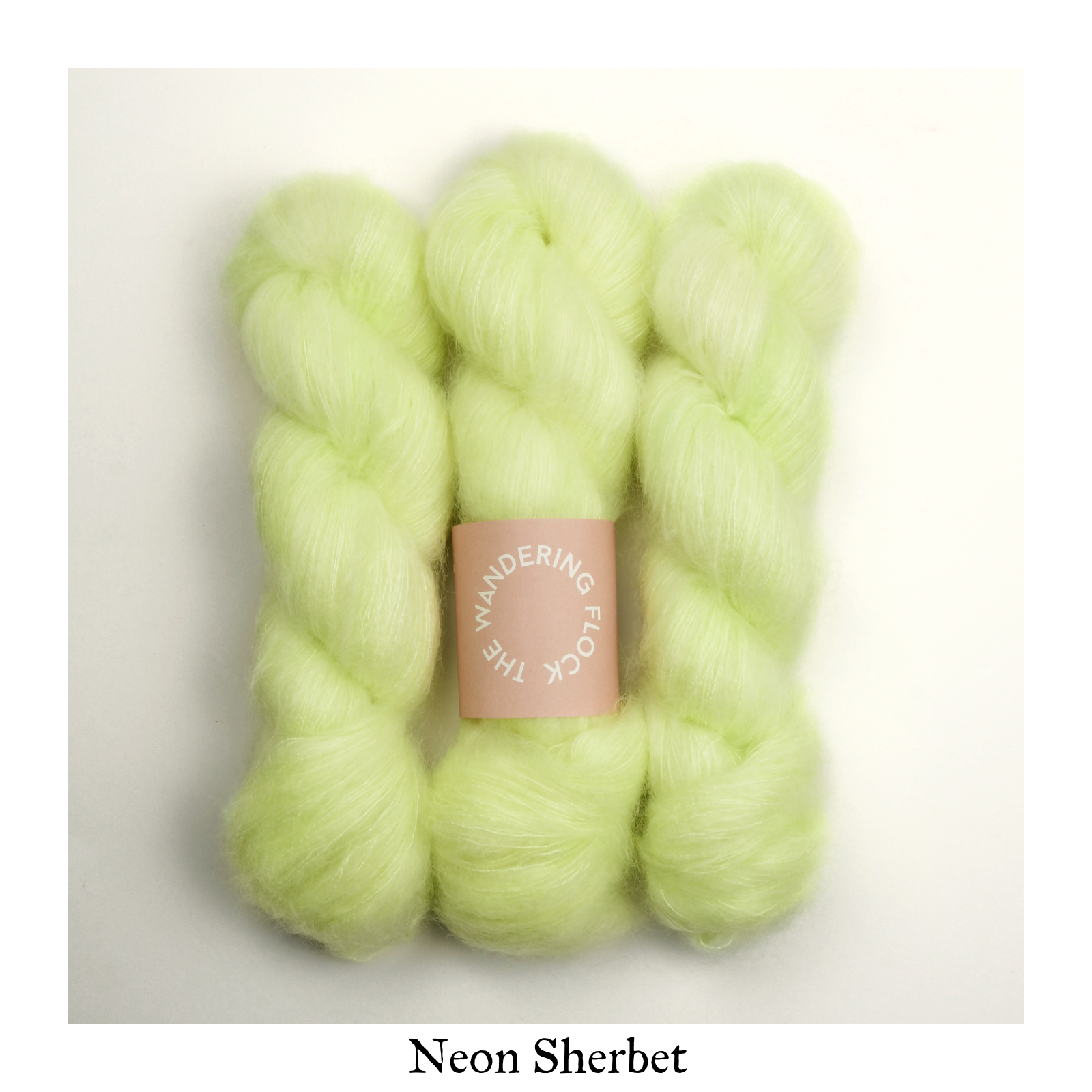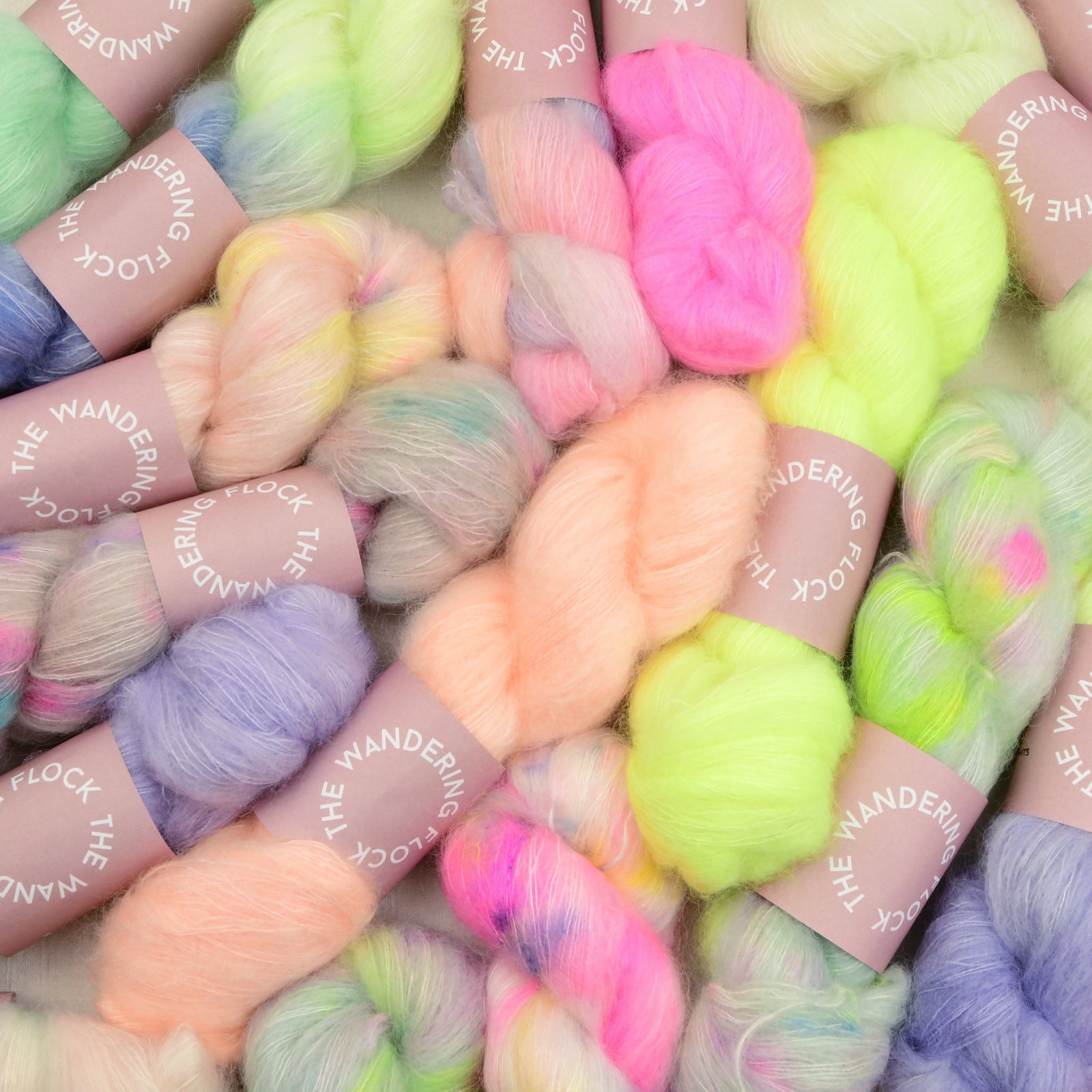 The Wandering Flock’s Mohair is so fluffy! With 393 meters for 50g, it contains 80% Mohair and 20% Silk, it is super soft and creates a gorgeous halo when held together with another yarn.