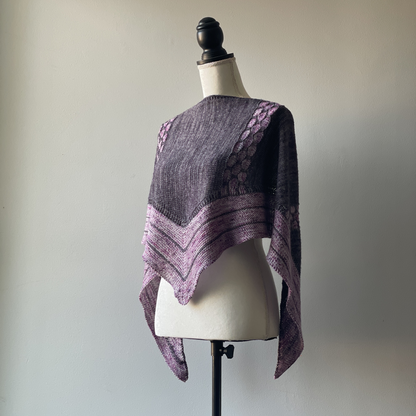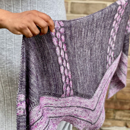 Shay had this idea of a 1970s inspired shawl knit in a sideways construction, with an unique, geometric shape. Named after her grandfather, the Winston shawl features mosaic colorwork in high contrast colors. It has two size options: the small size requires only two skeins, one of each color, and the large size that calls for two skeins of each color.
